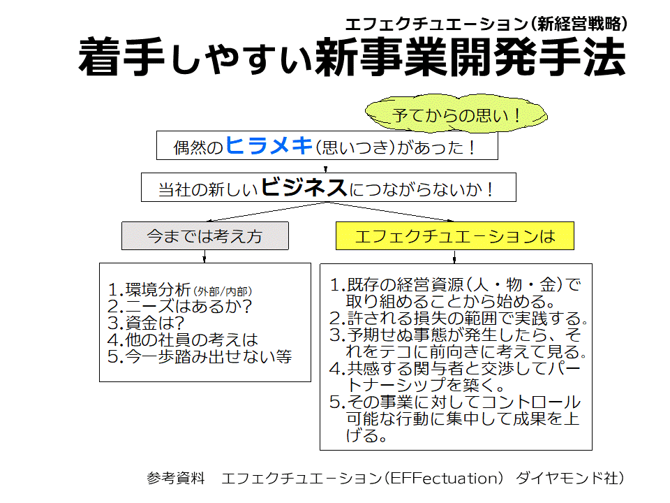新事業やアイディアを思いつき、何とか取り組みたいと思ったが、いろいろな事を考え一歩踏み出せない時。このエフェクチュエ-ションの5原則を十分に噛みしめているうちに、やれる気がしてきます。