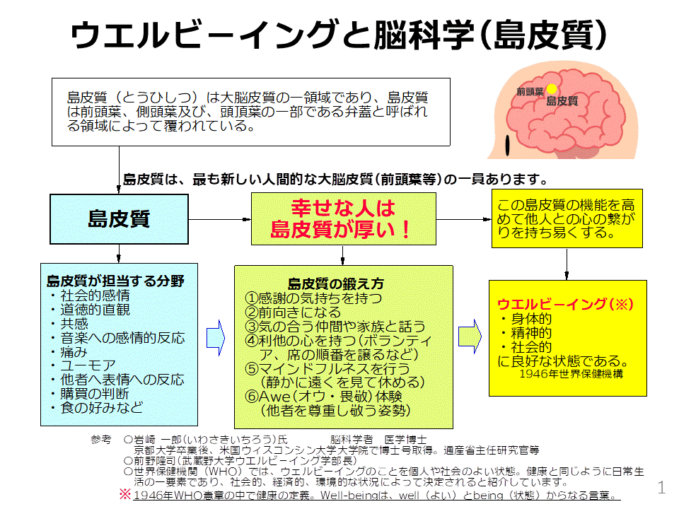 この島皮質を鍛えることでウエルビ-イングとなり、健康経営を支援するのでないかと思います。また、高齢者の生き方として、島皮質を鍛えることが健康で長生きするのでは・・・・。